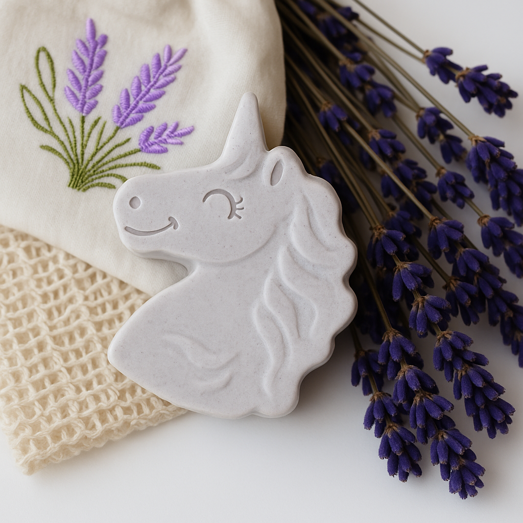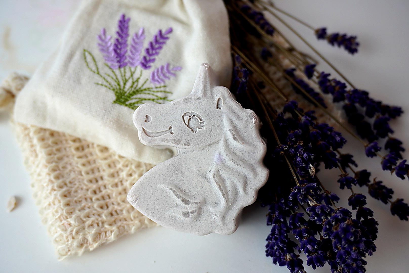Heerlijk geurende unicorn of eenhoorn lavendelzeep, ook geschikt voor de gevoelige (kinder)huid. Gemaakt van extra vierge olijfolie, kokosolie en cacaoboter met water en loog (anders verzepen de oliën niet) met een beetje Mica poeder voor de kleur, lavendelolie voor de geur en een snufje lavendelbloempjes. Deze zeep is ca. 100 gram. Er zijn 2 varianten van deze zeep: met de ogen dicht en met de ogen open.